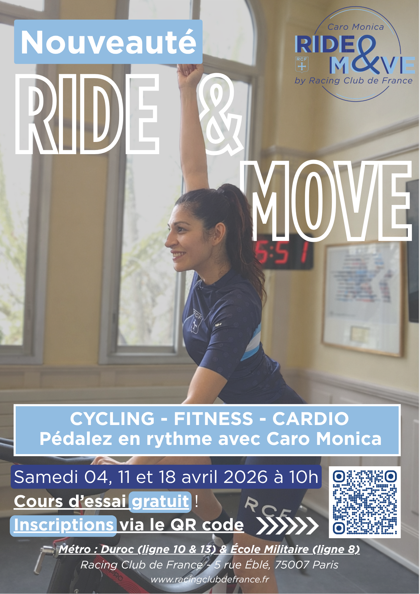 Venez découvrir notre nouveau cours de cycling : une session qui combine cycling, fitness et cardio, en musique, sous l'impulsion de notre coach Caro Monica !Ride & Move débarque au Racing Club de France :