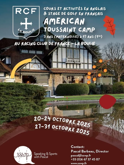Du 20 au 24 octobre 2025 et du 27 au 31 octobre, cours et activités en anglais et stages de golf en Français ! Choisissez la formule qui vous convient !